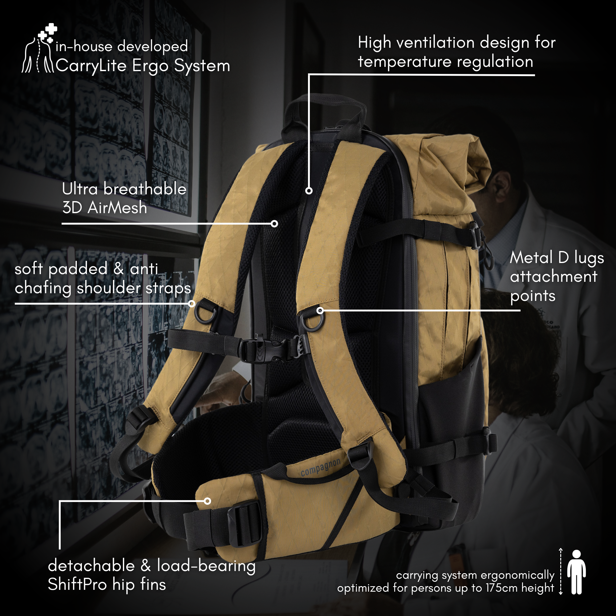 carrying system developed by us for uniquely back-friendly comfort on a camera backpack. Supplemented with practical features & premium materials.