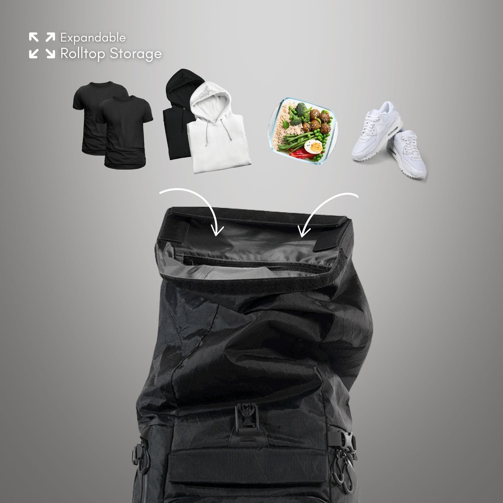 Expandable roll-top storage area for additional volume, can optionally be closed with a Velcro flap