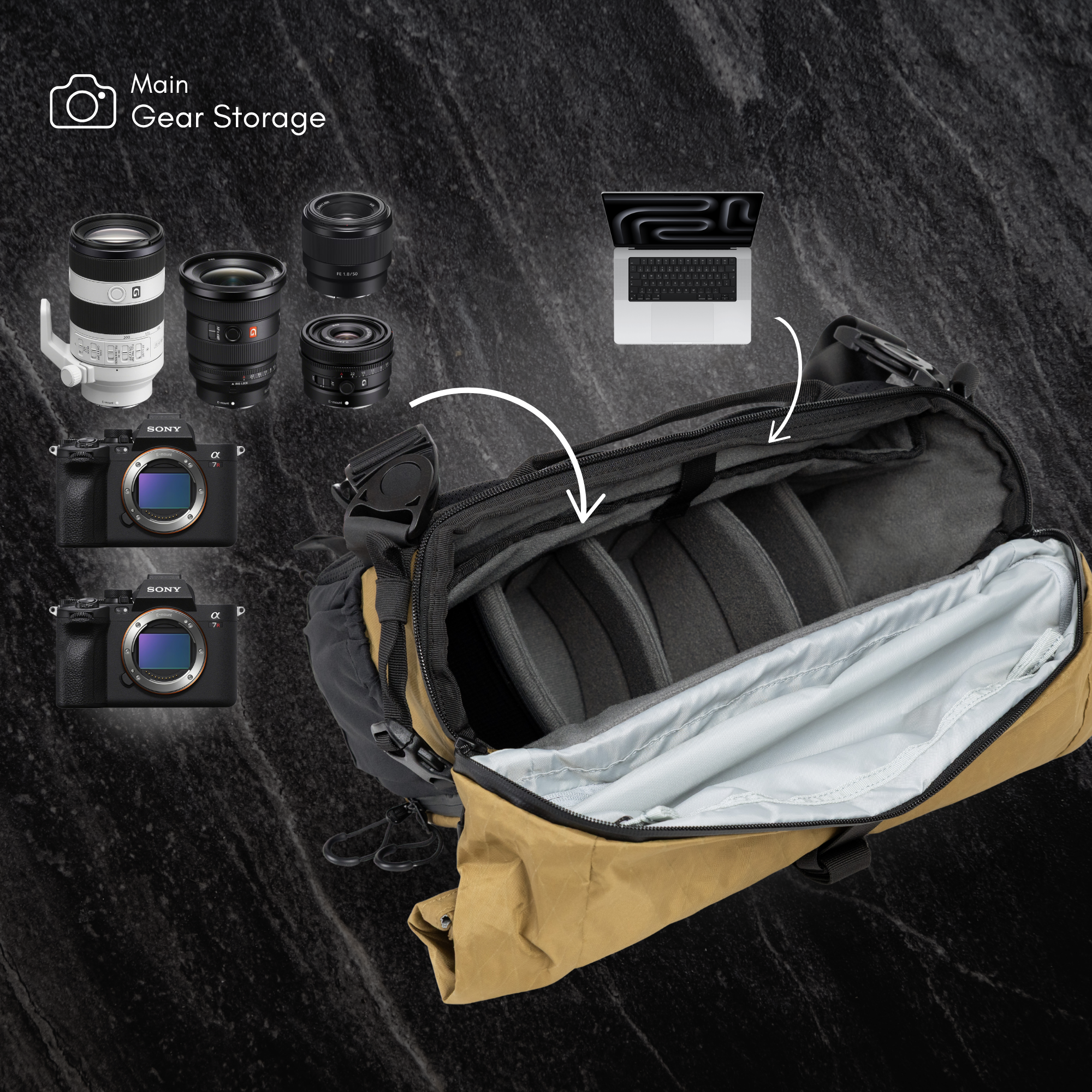 Schneller, übersichtlicher Zugriff auf deine Kamera von oben mit wetterfestem YKK Aquaguard Reißverschluss.