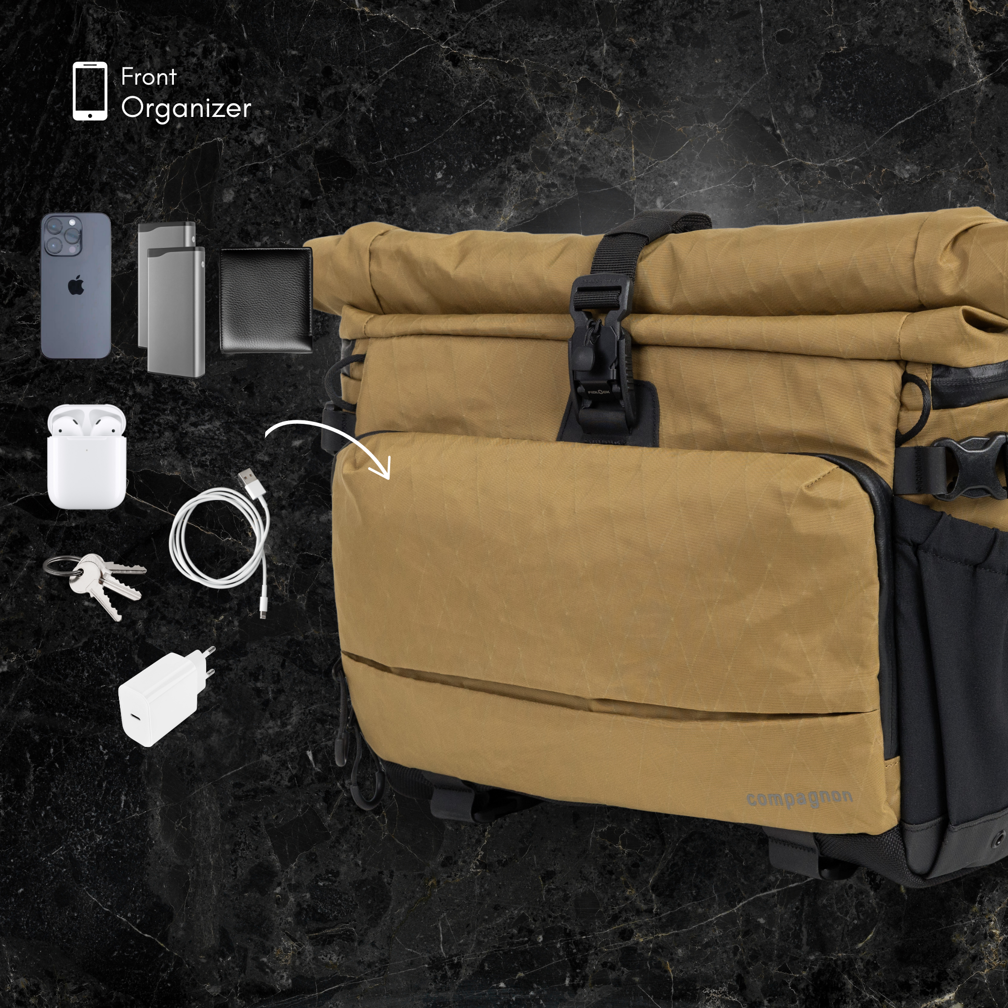 The main compartment offers approx. 12L volume for your gear. Additionally, you can separately use 6L of storage space in the roll-top according to your needs or combine it with an open partition to create one larger storage space.