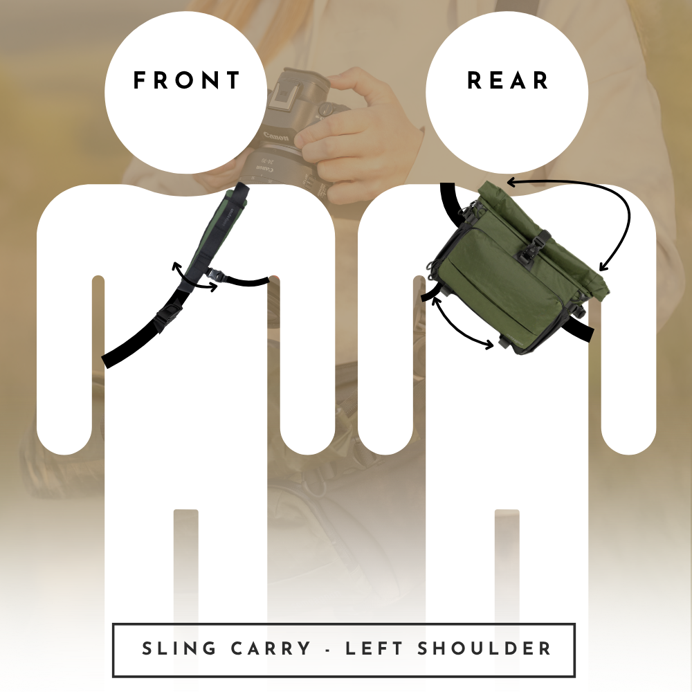 Die Sling-Tragepositon auf der linken Schulter. So bekommst du genau den Komfort und die Ergonomie, die du brauchst.