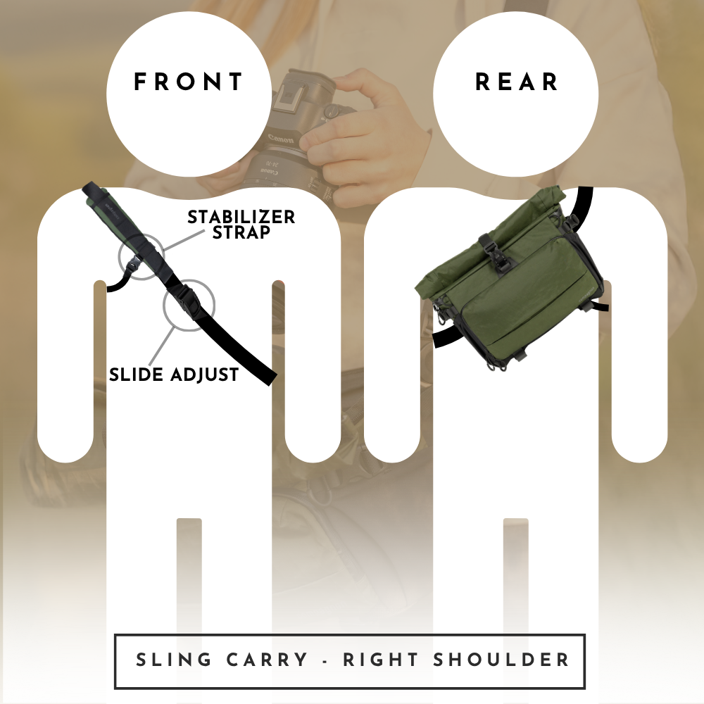 Hier siehst du die korrekte Trageposition als Sling auf der rechten Schulter.