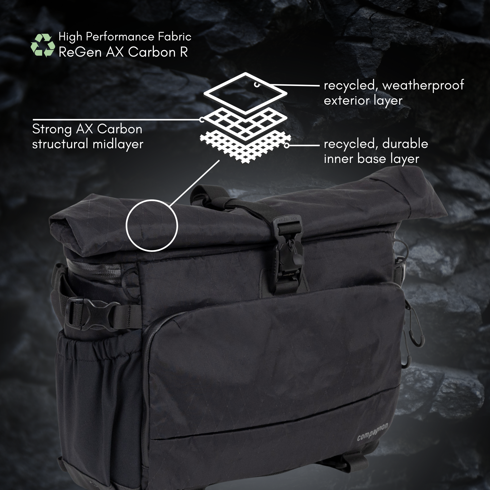 The outer shell, for example, is crafted from ReGen Carbon AX R, an amazing multi-layer fabric recycled from 100% plastic waste. Internally reinforced with bundled high tensile fibers, extremely robust and with a weather resistance that will even exceed premium tents.