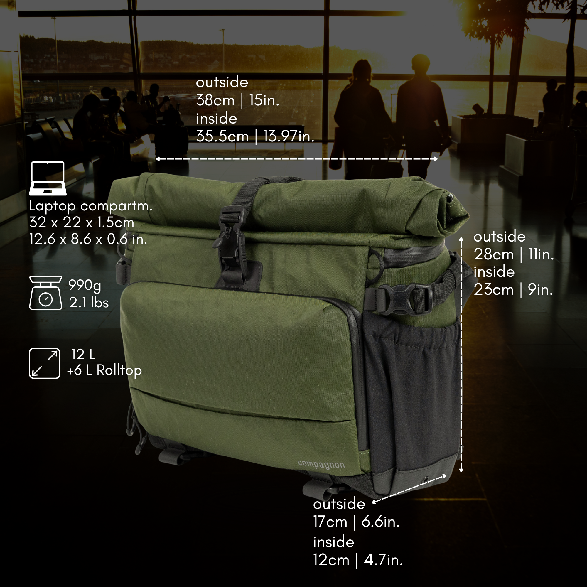 The main compartment offers approx. 12L volume for your gear. Additionally, you can separately use 6L of storage space in the roll-top according to your needs or combine it with an open partition to create one larger storage space.