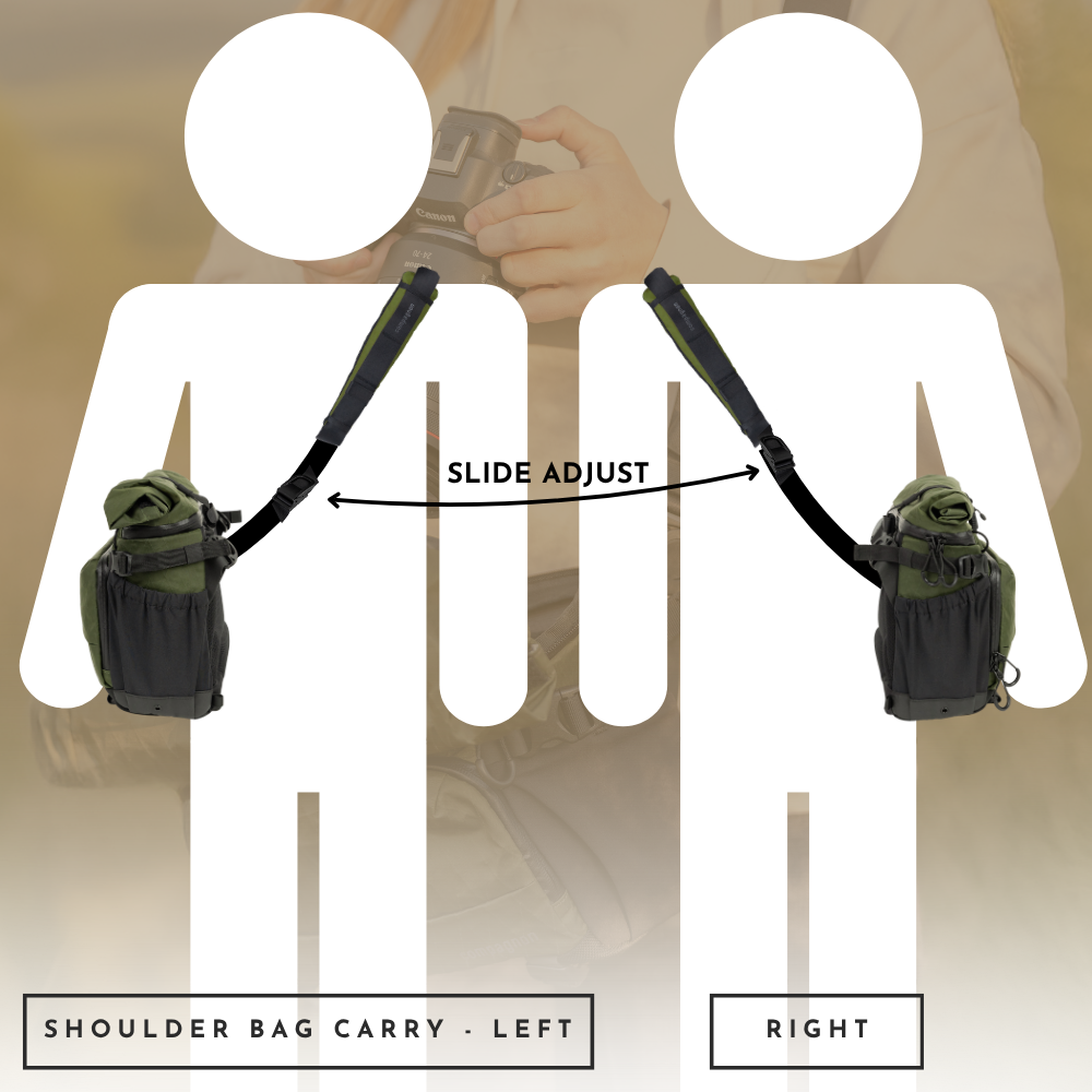 Unsicher ob die Gurt-Position für die gewünschte Schulter stimmt? Platziere das Polster des Variostrap auf deiner Schulter. Wenn der Slide Adjust Versteller griffbereit unterhalb des Polsters sitzt, ist der Gurt korrekt positioniert.
