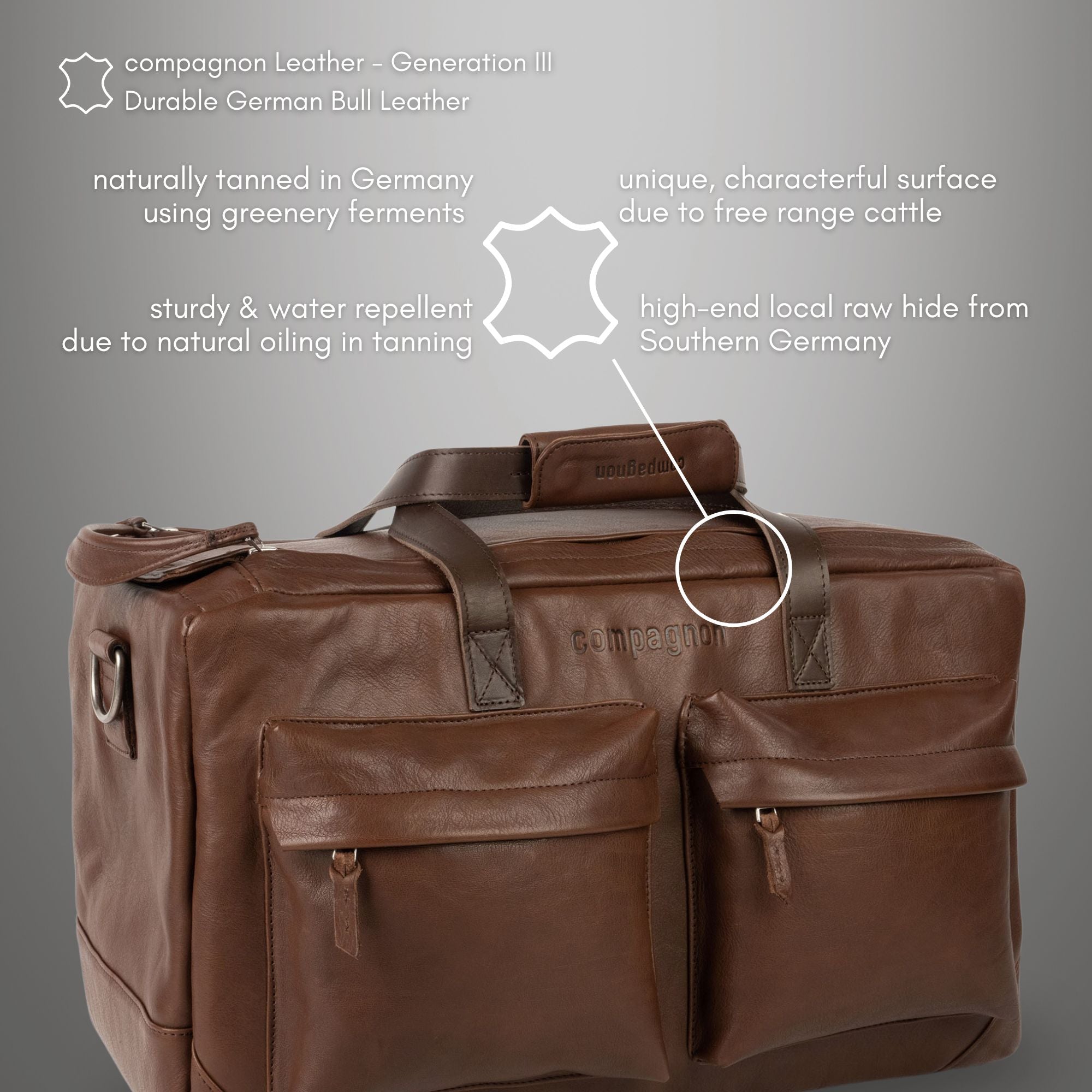 Naturally tanned compagnon leather from southern Germany is something special. The feel, look and durability are fabulous and just right for leather lovers. The robustness of this material and all its components gives your compagnon a very long life.