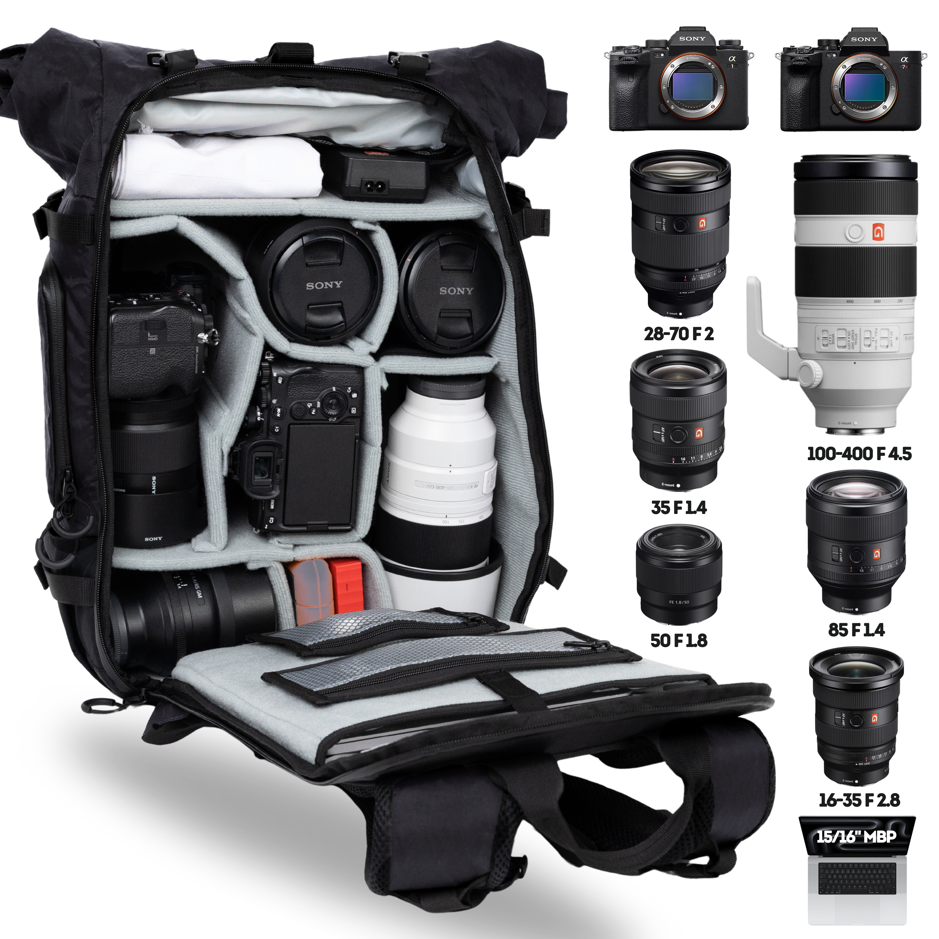 You might as well open the dividing wall between rolltop and main storage and remove all padded dividers you don't need. This way you can securely pack a small camera/lens kit and have all the remaining capacity available for your luggage.