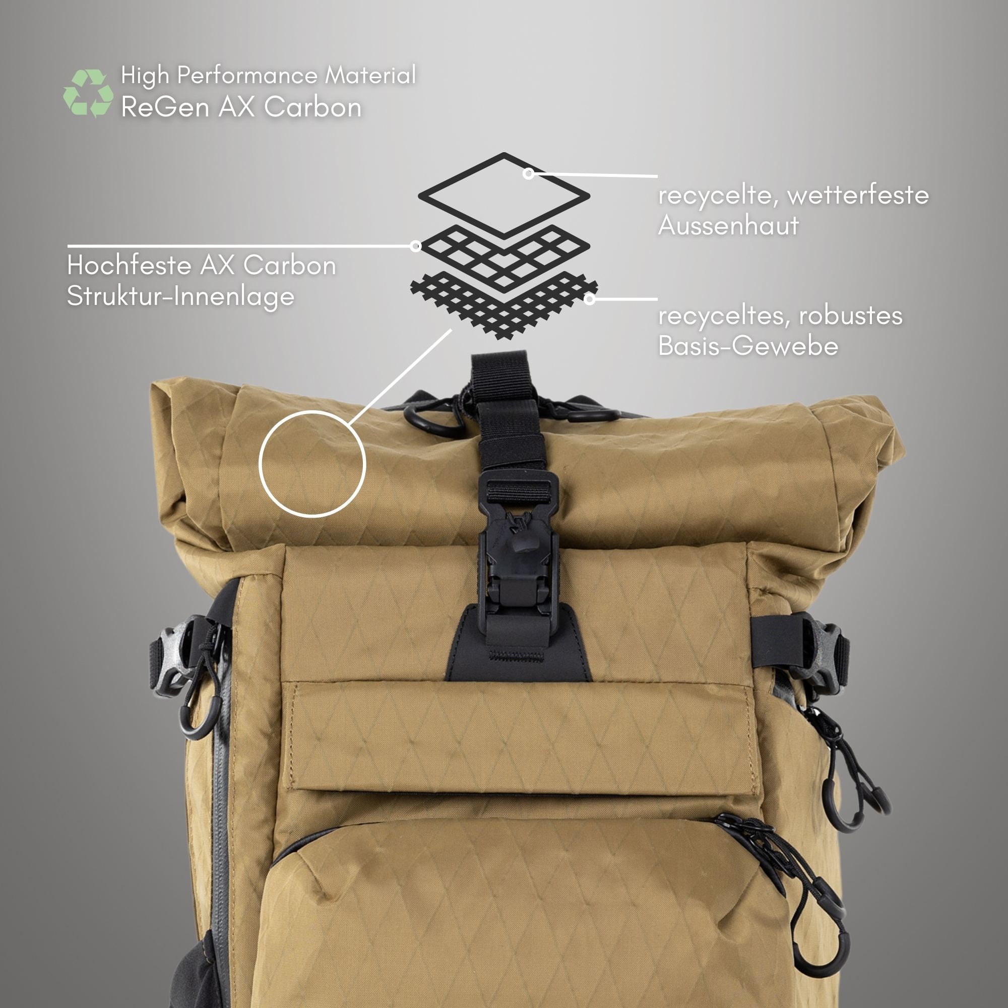 AX Carbon reinforces the entire fabric with the characteristic grid structure that characterizes our Element Line. High-strength, bundled fibers multiply the tear resistance, durability and stability of the entire outer skin.