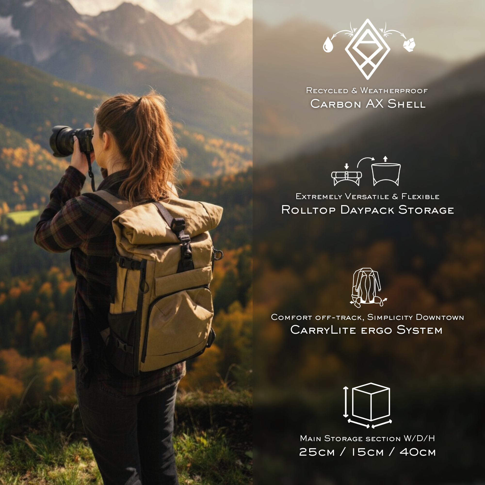 I love my backpack! It's super robust and fits all my equipment. (...) The carrying comfort is great for my size. Mountain hikes over many hours are no problem at all. What's more, the moisture protection is very good. However, even the backpack is not completely waterproof in continuous rain for several hours. I am absolutely convinced by the product!