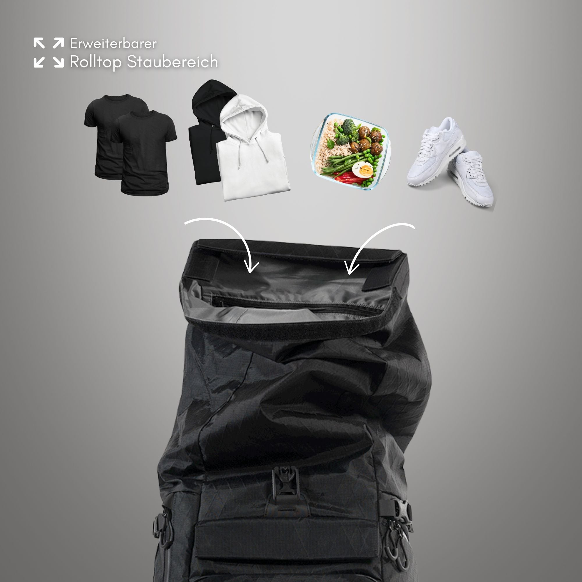 Compartimento enrollable extensible para volumen adicional, opcionalmente se puede cerrar con una solapa de velcro