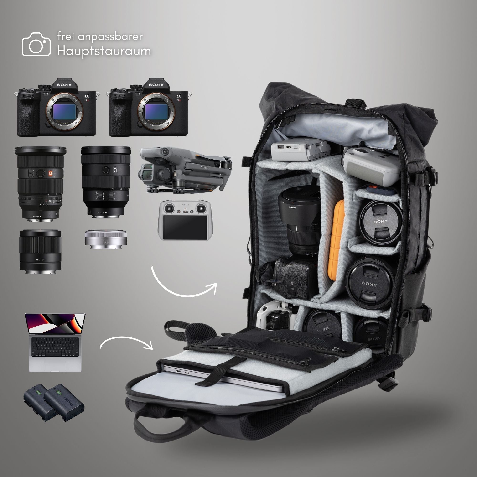 sistema de transporte desarrollado por nosotros para una comodidad única para la espalda en una mochila para cámara. Complementado con características prácticas y materiales de primera calidad.