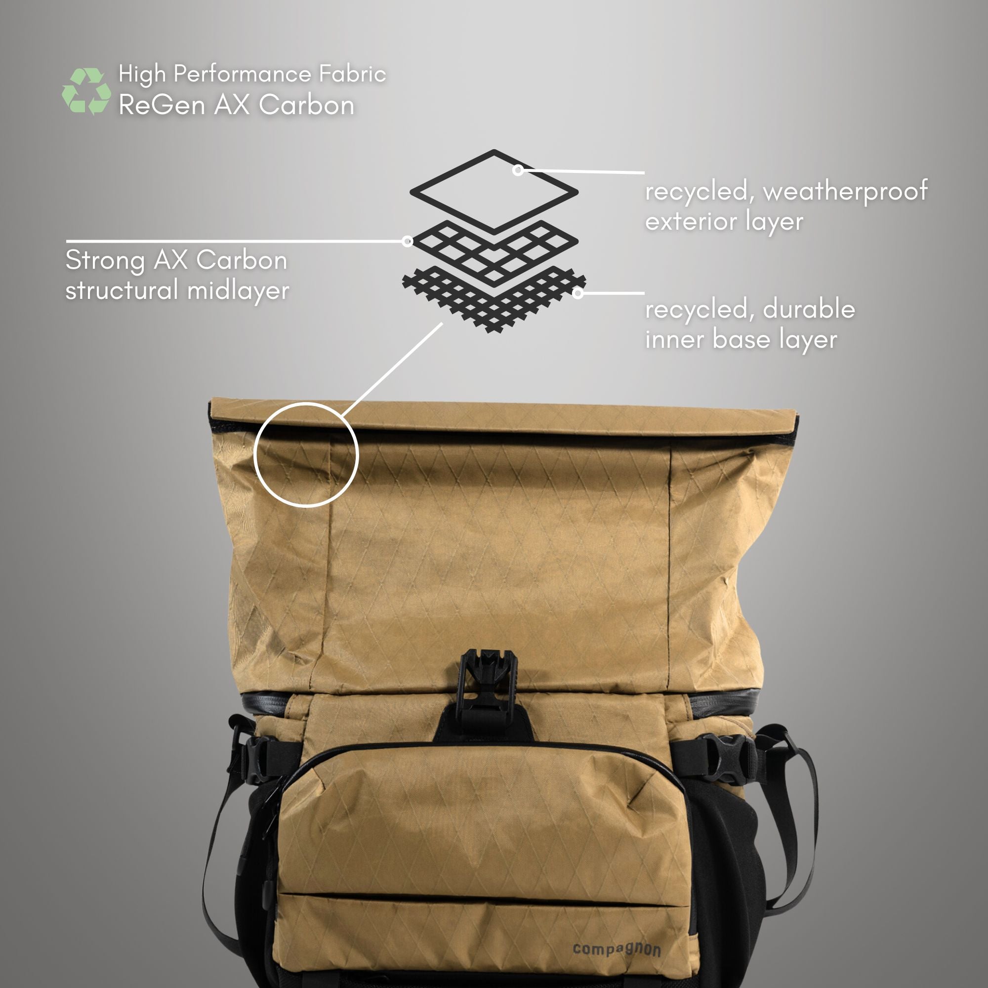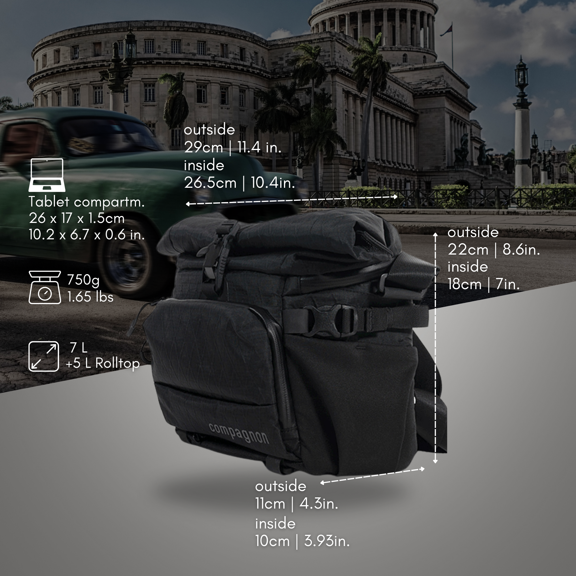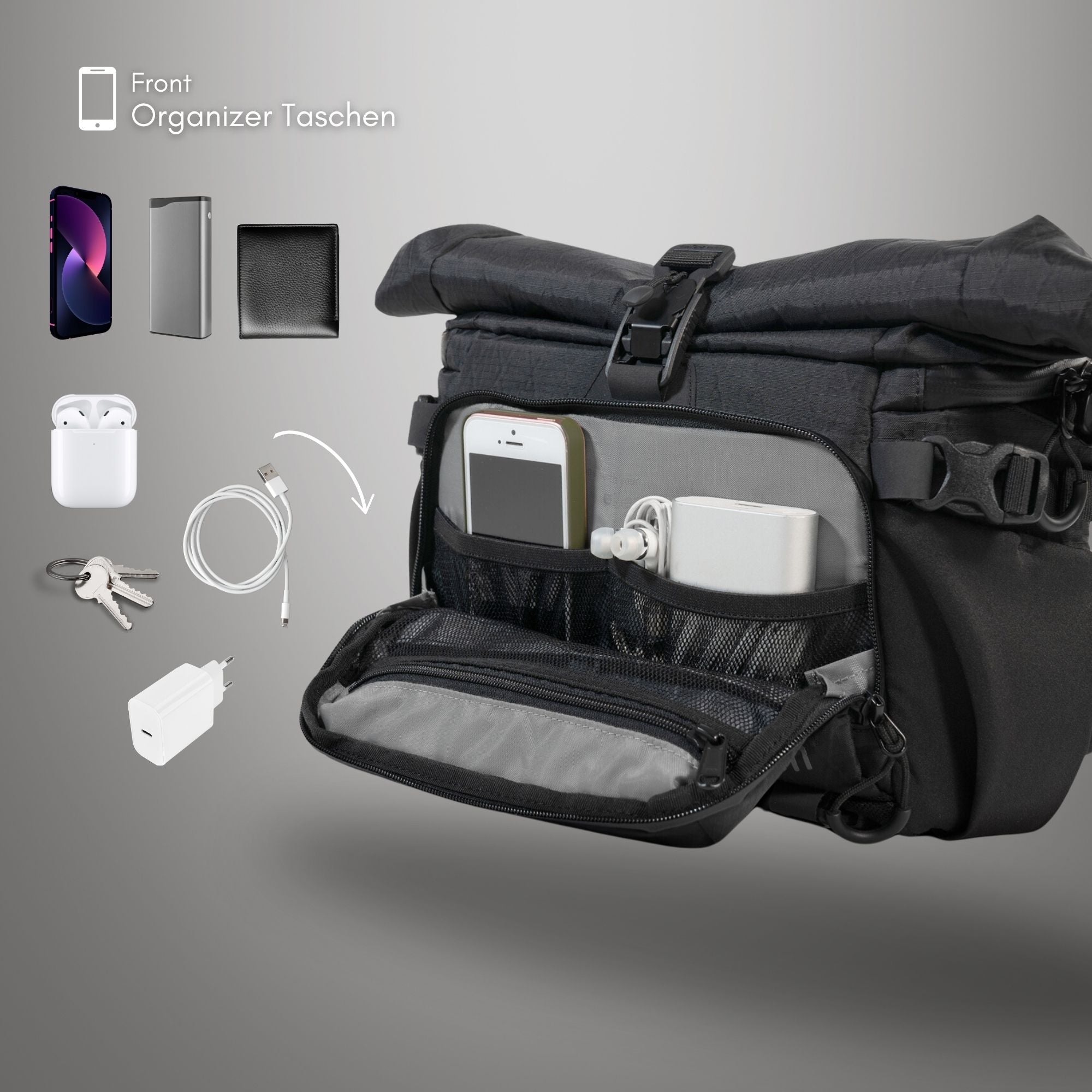 El espacio de almacenamiento principal ofrece aproximadamente 7 litros de volumen para su equipo. Además, puede utilizar 5 litros de espacio de almacenamiento en el roll-top por separado según sus necesidades o combinarlo con una partición abierta para crear un espacio de almacenamiento.