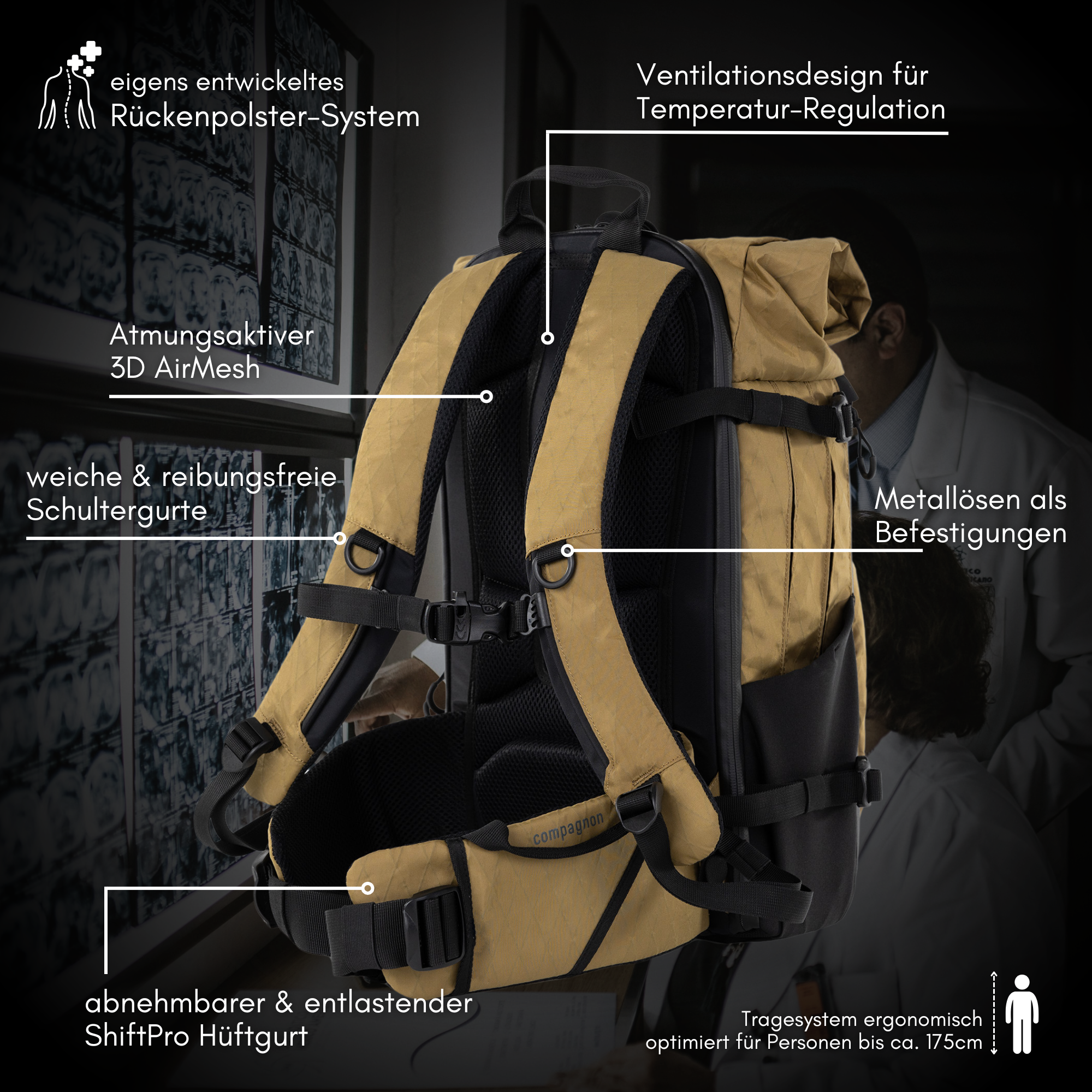 von uns entwickeltes Trage-System für einmalig Rücken-schonenden Komfort an einem Kamerarucksack. Ergänzt mit praktischen Features & Premium Materialien.