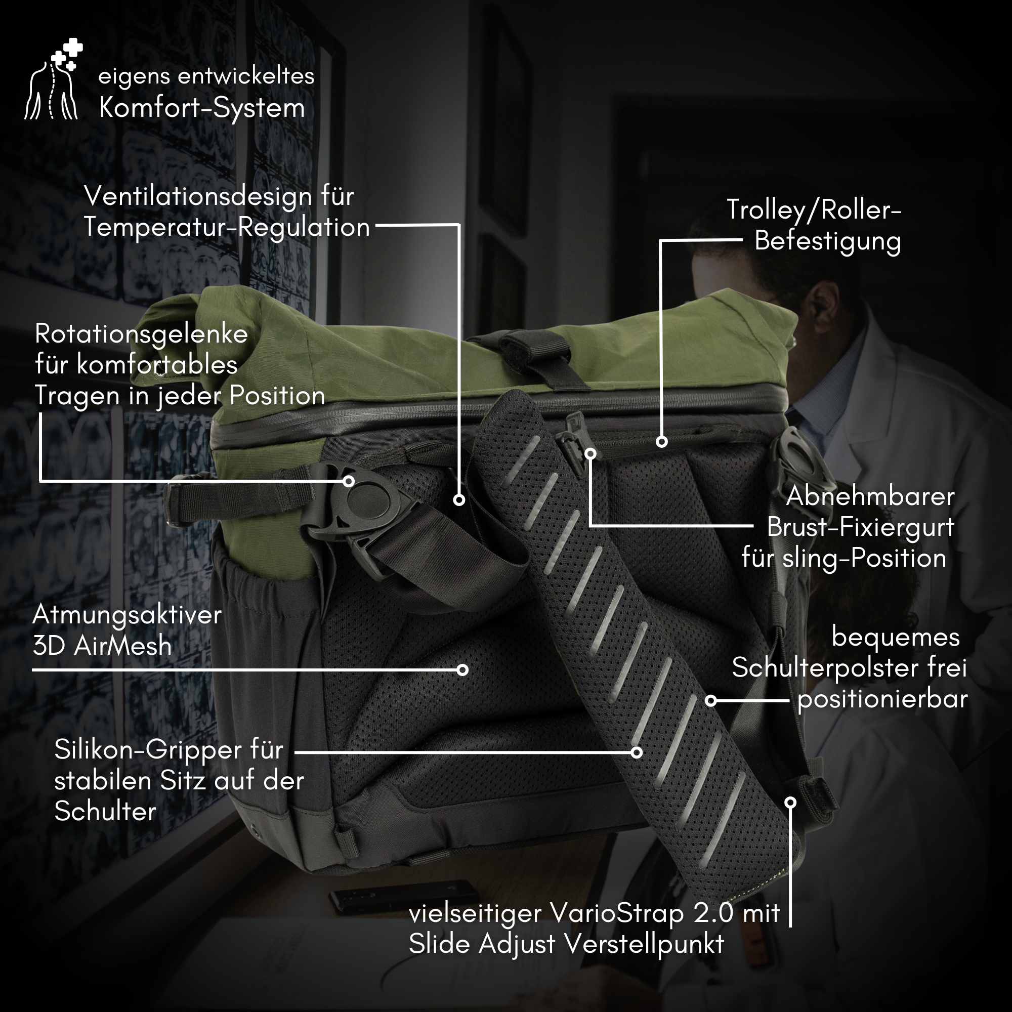 Wer reichlich Ausrüstung einpacken kann, sollte so leicht tragen wie nur möglich. Darum ist jetzt ein Trolley-/Rollkoffer-Fixierung Teil der Ausstattung. Für den Komfort sorgt der geniale VarioStrap 2.0