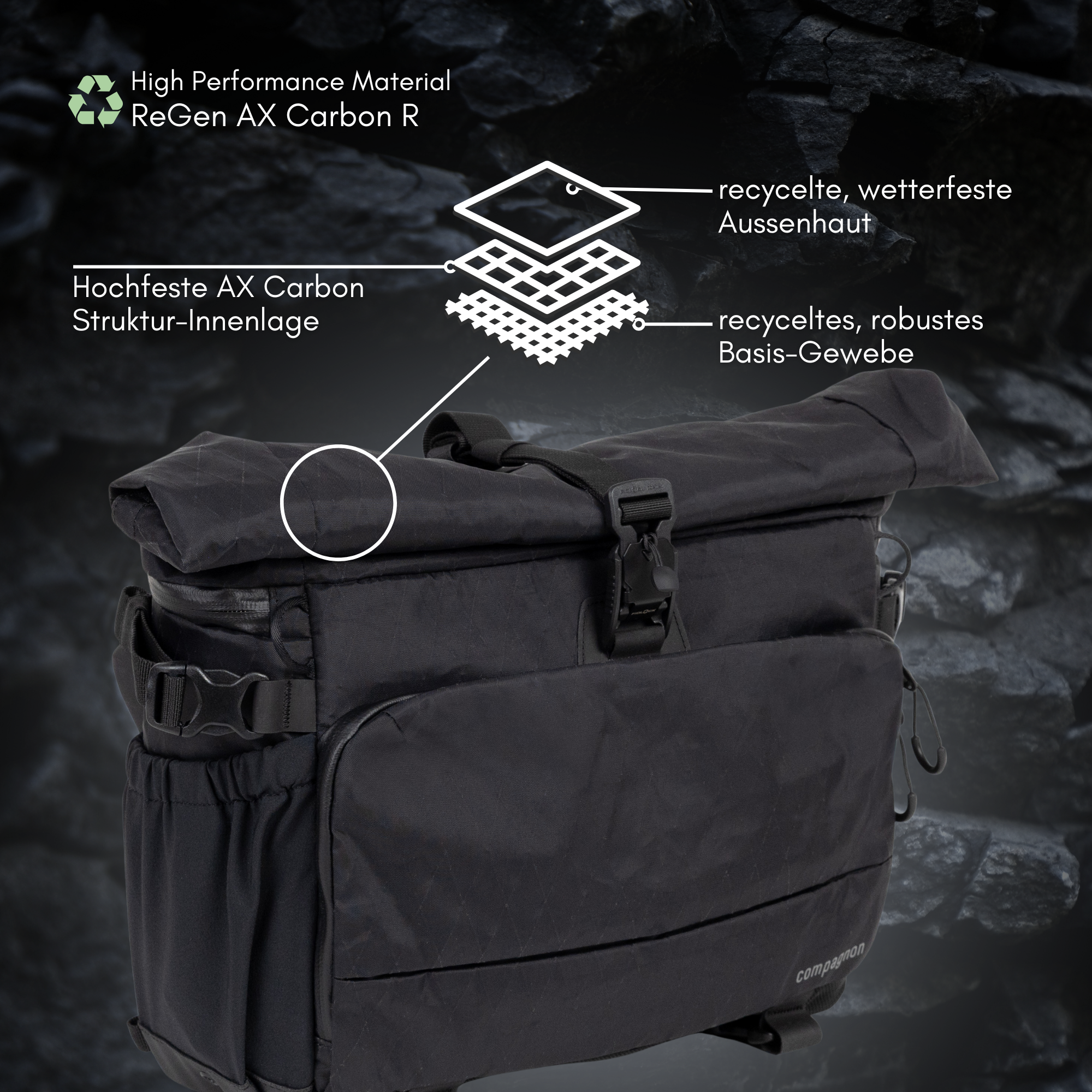 Die Außenhaut besteht z.B. aus ReGen Carbon AX R, einem erstaunlichen Mehrschicht-Gewebe aus 100% recycelten Kunststoffabfällen. Intern verstärkt mit gebündelten Fasern, extrem robust und mit einer Wetterfestigkeit, die sogar Premium-Zelte staunen lässt.